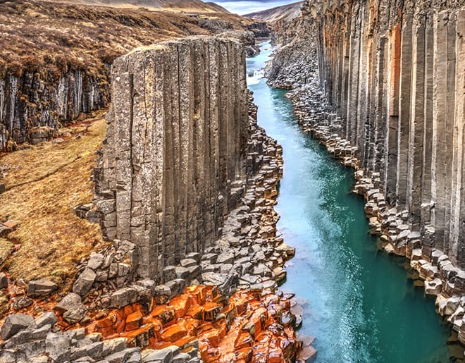 Visitaremos el fantástico Studlagil, un cañón impresionante formado por columnas basálticas que parecen simular a las pipas de un órgano musical. Una plataforma de observación les permitirá disfrutar de su gran belleza.