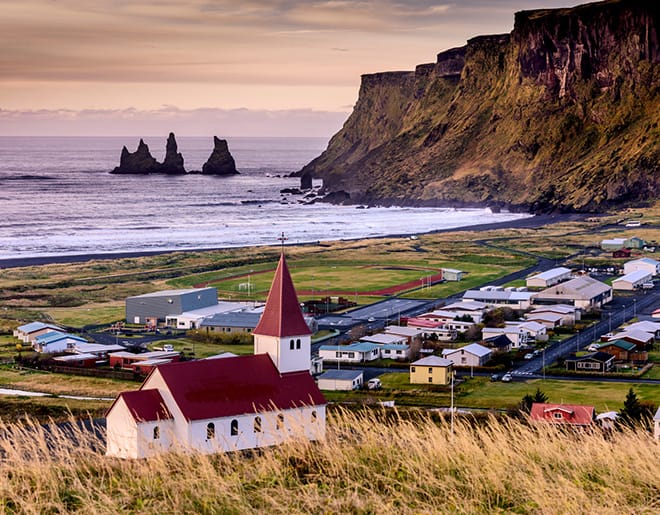 Conduciremos a través del paisaje escénico que brindan las granjas de la zona y pararemos para conocer las majestuosas cascadas Seljalandsfoss y Skogafoss; posteriormente llegaremos a Vik, el pueblo más meridional de Islandia.