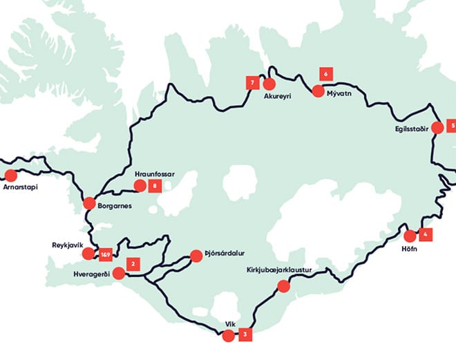 El recorrido termina en Hveragerdi, un bello pueblo ubicado en una zona geotermal, donde sus habitantes han hecho uso de las fuentes termales para proveer de energía a sus hogares y utilizarlas para cosechar frutas y vegetales.